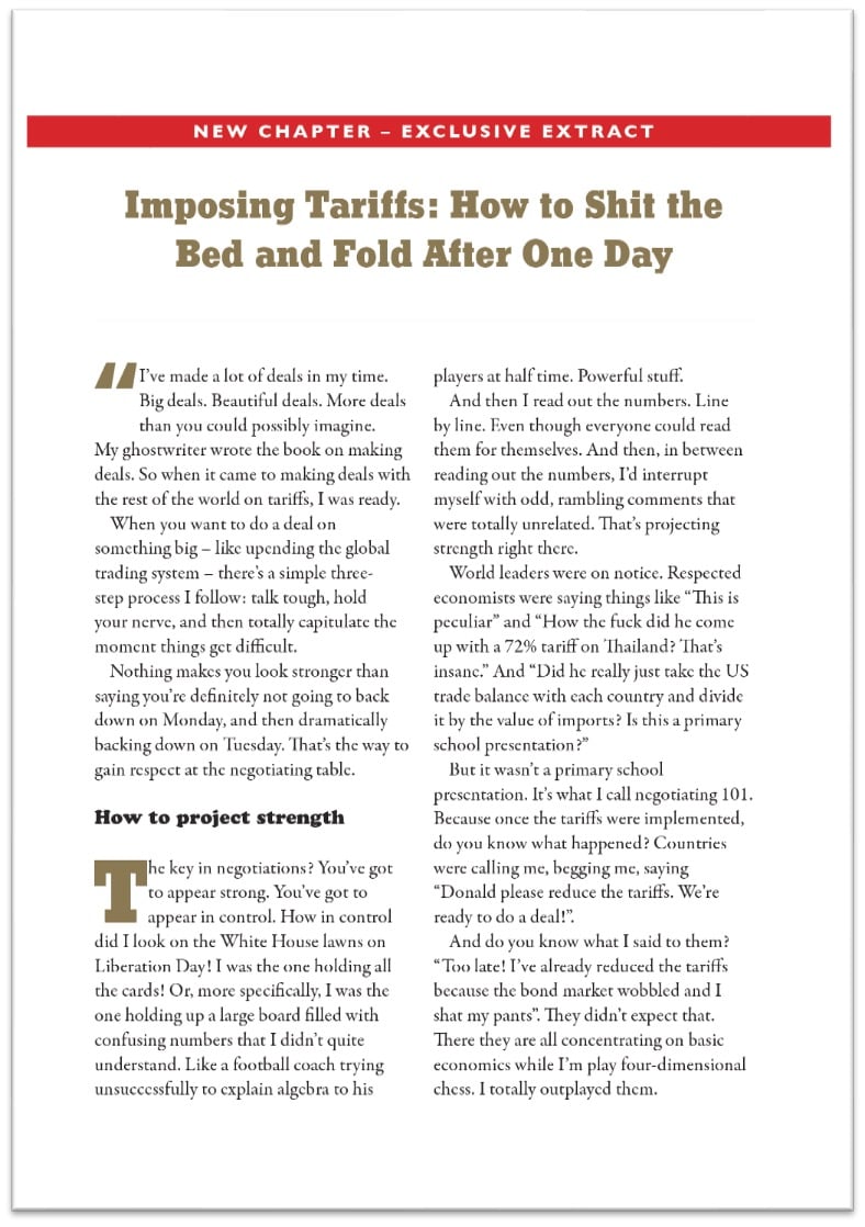 • An exclusive extract from The Art of The Deal – a new chapter about immediately folding when negotiating tariffs